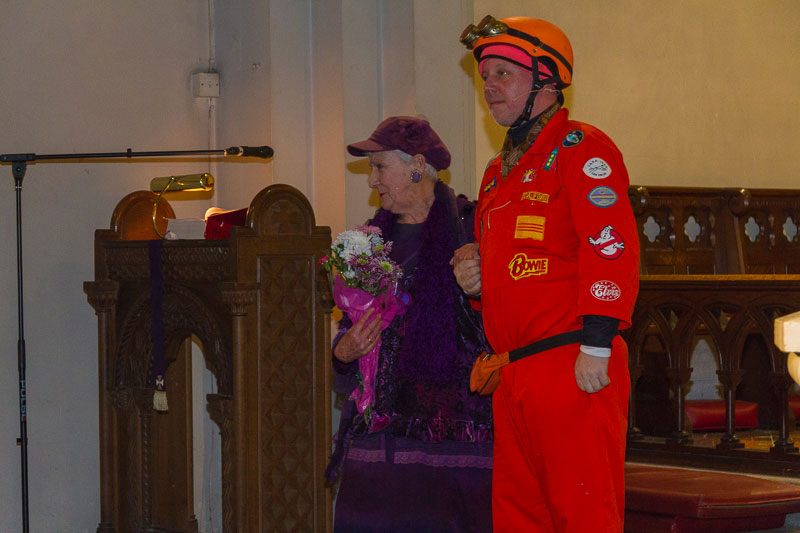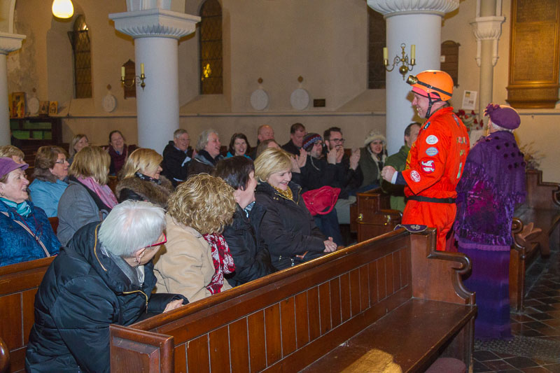 ALIGHT! culminated in a wonderfully evocative and playful MYSTERY, HISTORY, CABARET TOUR which ran for 3 performances at the end of February. The tour started in Ringsend and finished at The Vintage Inn Ringsend via St John’s Church, Sandymount. It included local performers the Dazallettes baton twirling group from St Andrews, Rodney Devitt as James Joyce and The Vintage Inn publican Kathy Gleeson, and involved the imaginative re-telling of stories collected over the course of the project. Led by the ever-engaging MC Hugh Brown in an orange boiler suit and goggles, performances took place on and off the double decker in spaces both large and small. It was a moving finale to a rich and colourful project, and as Hugh memorably stated at the end of the cabaret tour, ‘ this area is changing fast, but if the creativity, passion and commitment of the local community is anything to go by – it is in safe hands for the future’.
