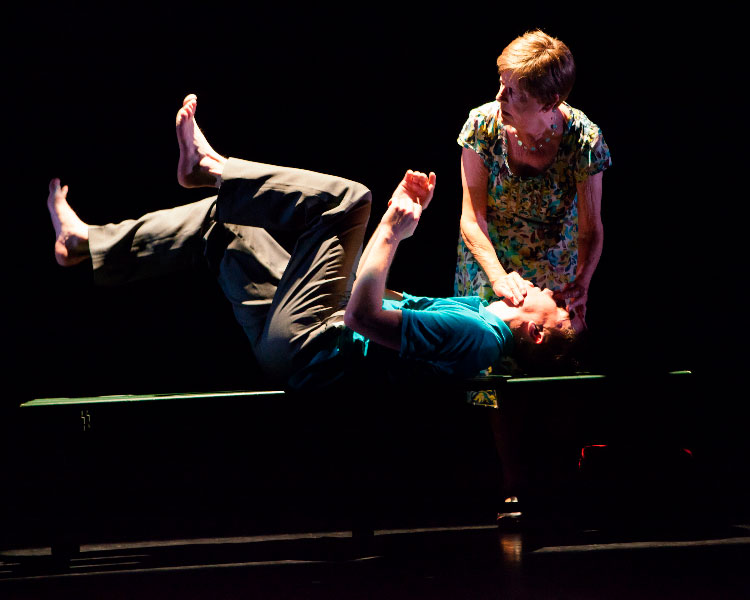 The companionship of mother and son seeped onto the stage in David Bolger’s wonderfully gentle, perfectly formed duet, Swimming With My Mother at Project Cube. The tone was nostalgic but not sentimental and created a perfectly managed exchange of roles. Is she teaching the choreographer to swim or is he teaching his mother to dance? The bonding and the different physical capacities were adroitly harnessed and it was good to see Bolger in performance again, always engaging, never too self-aware. Madge Bolger was consummately at ease, as the duo tripped through some clever intimations of synchronized swimming strokes. These moves were then counter-pointed by some waltz and cha-cha moves, evoking the swaying ballroom dances of old. A sequence of distressed moves, of arching back, grappling arms and flailing limbs, as nightmares raged and then were calmed, also bore the mark of interdependence. In this light and humane dance work you could almost smell the sea and feel the grainy sand between your toes as mother and son sat companionably on the bare bench, swinging legs.